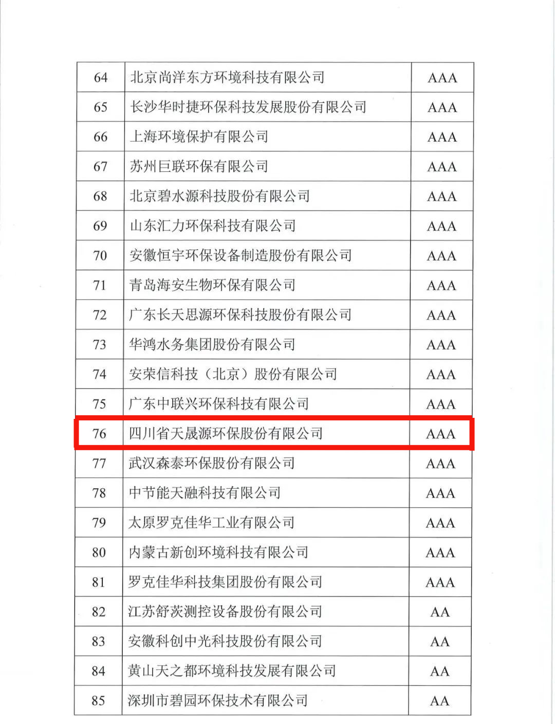 10月31日,在2023年中環(huán)協(xié)第十五輪環(huán)保企業(yè)信用評(píng)價(jià)中,四川省天晟源環(huán)保股份有限公司(簡(jiǎn)稱:“天晟源環(huán)?!保┰俅螛s獲中國(guó)環(huán)保產(chǎn)業(yè)協(xié)會(huì)授予的“AAA級(jí)環(huán)保企業(yè)信用評(píng)價(jià)”榮譽(yù)。這是天晟源環(huán)保繼2020年首次獲得該項(xiàng)榮譽(yù)并期滿后,再次以優(yōu)秀的表現(xiàn)和扎實(shí)的環(huán)保業(yè)績(jī)獲得此項(xiàng)頂級(jí)評(píng)價(jià)。